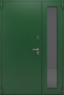 Полуторная металлическая термодверь с остеклением и зеленым порошковым покрытием — выбор тех, кто ценит комфорт и эстетику. Панели из МДФ придают двери солидный и завершённый внешний вид. Гармонируют с цветовой палитрой фасада и внутренней отделки. Отделка подойдет владельцам домов с деревянным фасадом.