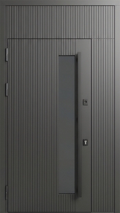 Входная остекленная группа с терморазрывом, длинной ручкой и панелями МДФ графит с линейным фрезерованием сочетает в себе прочность и изысканный внешний вид. Панели из МДФ обеспечивают дополнительную теплоизоляцию. Делают дверь визуально выразительной и современной. Оформление подойдет для загородного коттеджа в классическом и современном стиле.